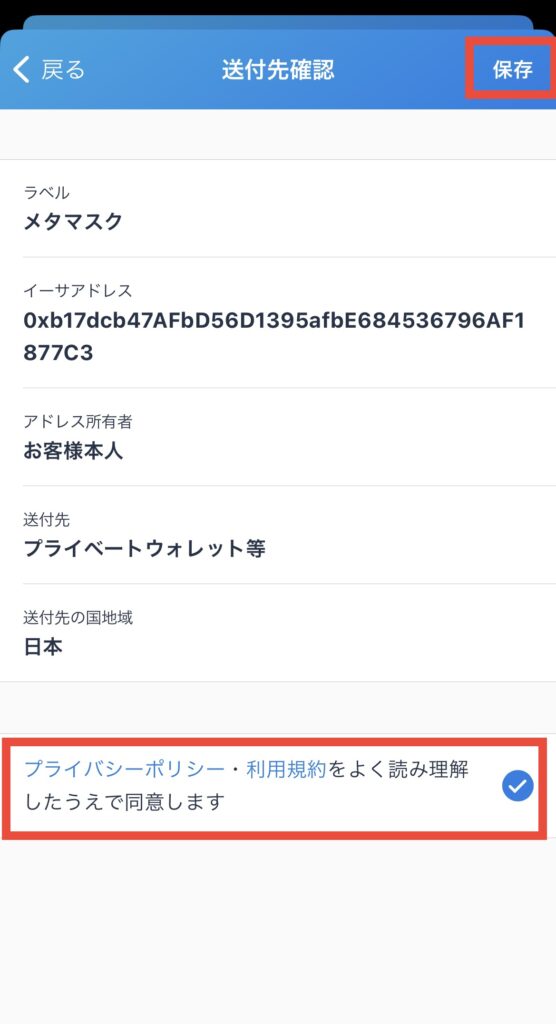 送付先を確認して、プライバシーポリシー・利用規約の同意にチェックを入れます。「保存」をタップ。