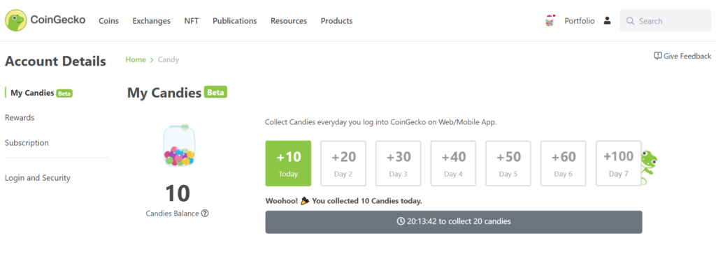 CoinGeckoは暗号資産のチャートを確認するだけではなく、毎日キャンディをゲットできる利点もあります。
