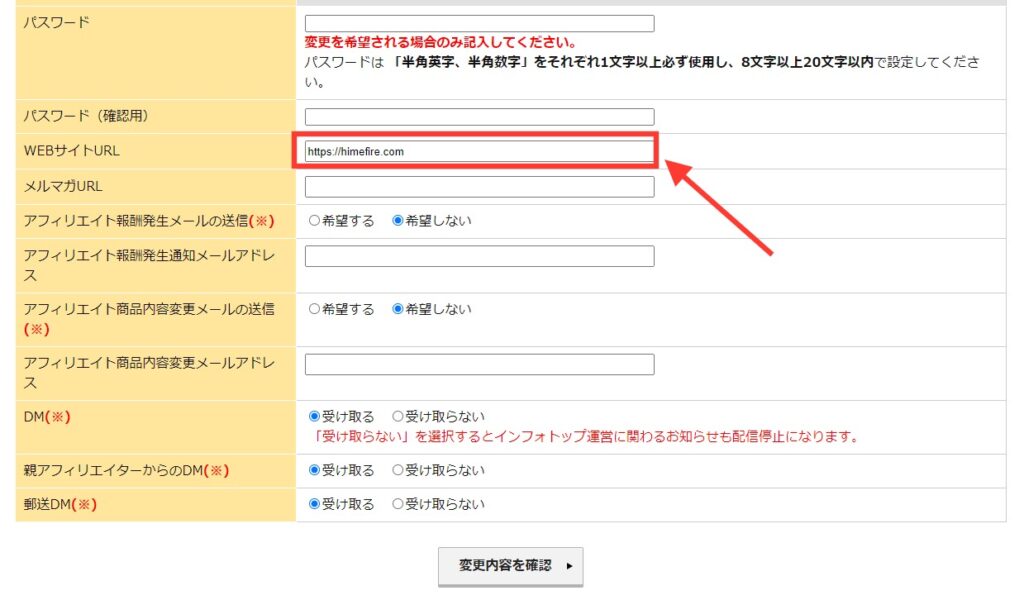 WebサイトURLもしくはメルマガURLを入力して「変更内容を確認」ボタンをクリック。